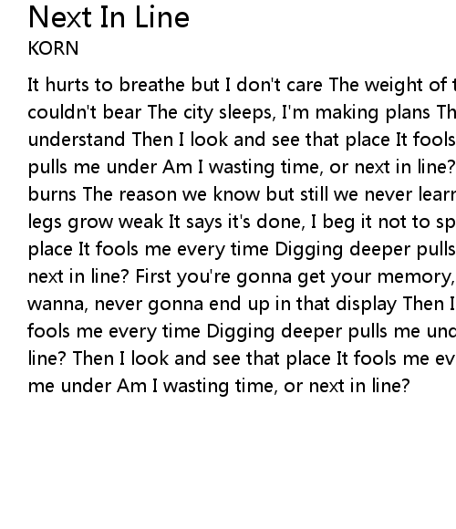 It hurts to breathe but I don't care The weight of the world, the thoughts I couldn't bear The city sleeps, I'm making plans The less you know, the better understand Then I look and see that place It fools me every time Digging deeper pulls me under Am I wasting time, or next in line? I pace and fret, my blood, it burns The reason we know but still we never learn The clocks stand still, my legs grow weak It says it's done, I beg it not to speak Then I look and see that place It fools me every time Digging deeper pulls me under Am I wasting time, or next in line? First you're gonna get your memory, you're a ****ing fray Never wanna, never gonna end up in that display Then I look and see that place It fools me every time Digging deeper pulls me under Am I wasting time, or next in line? Then I look and see that place It fools me every time Digging deeper pulls me under Am I wasting time, or next in line?