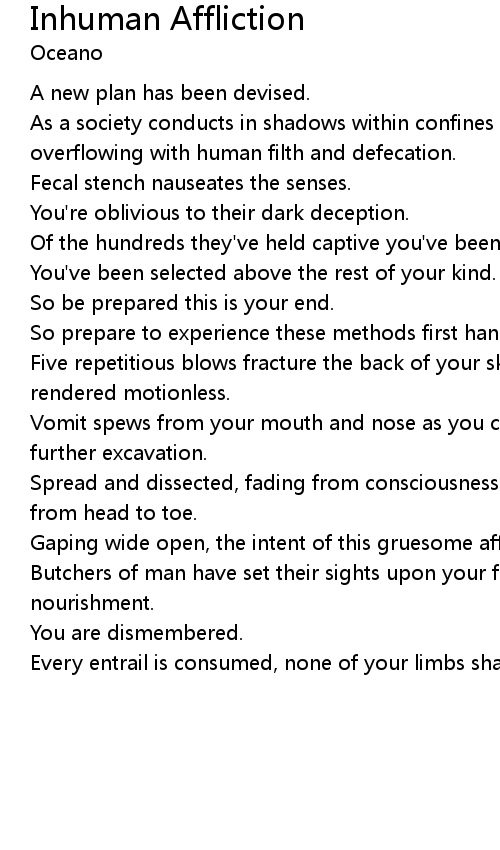 | Spread and dissected, fading from consciousness, your blood soaked body skinned from head to toe. | |