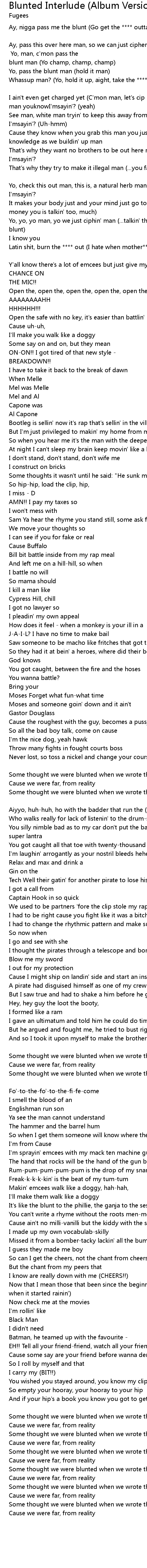 And so I took it upon myself to make the brother walk the plank [Chorus: Wyclef Jean & Lauryn Hill] |