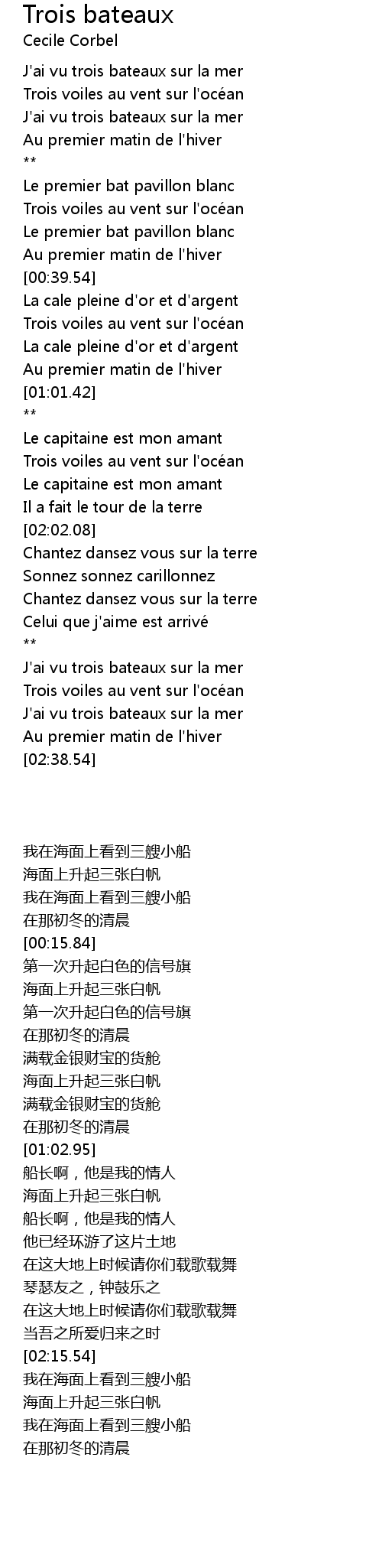 | [00:07.96] | J' ai vu trois bateaux sur la mer |