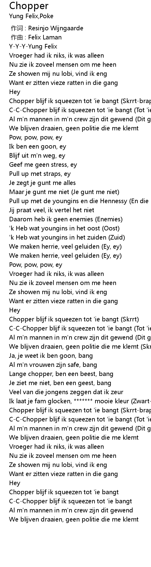 | [00:14.94] | Chopper blijf ik squeezen tot ' ie bangt Skrrtbrap |