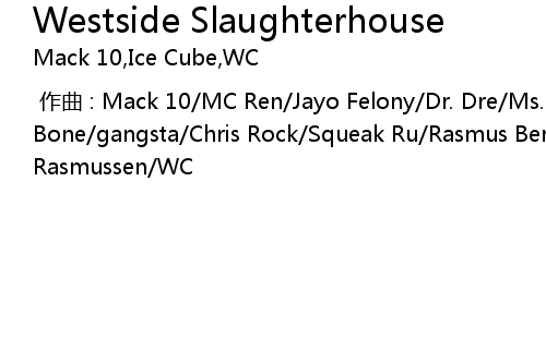 | [00:00.000] | 作曲 : Mack 10/MC Ren/Jayo Felony/Dr. Dre/Ms. Toi/Krayzie Bone/gangsta/Chris Rock/Squeak Ru/Rasmus Berg/Jesper Dahl/Nick Kvaran/Henrik Rasmussen/WC |