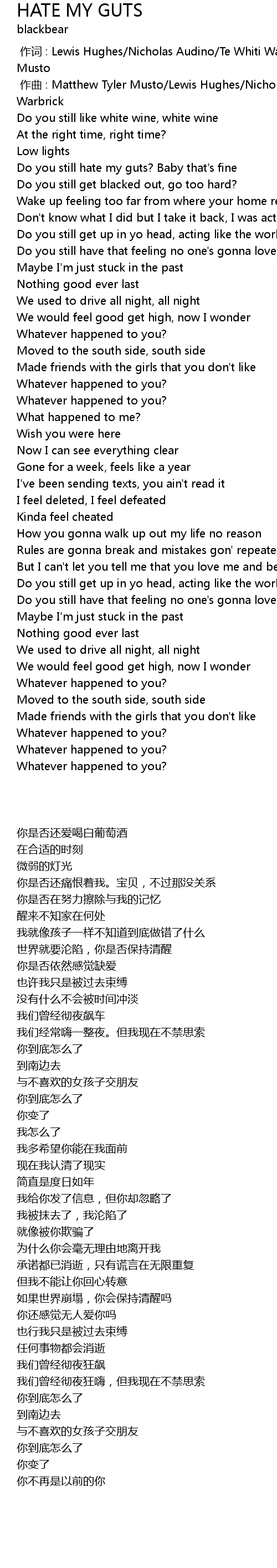 | [00:01.000] | 作曲 : Matthew Tyler Musto/Lewis Hughes/Nicholas Audino/Te Whiti Warbrick |