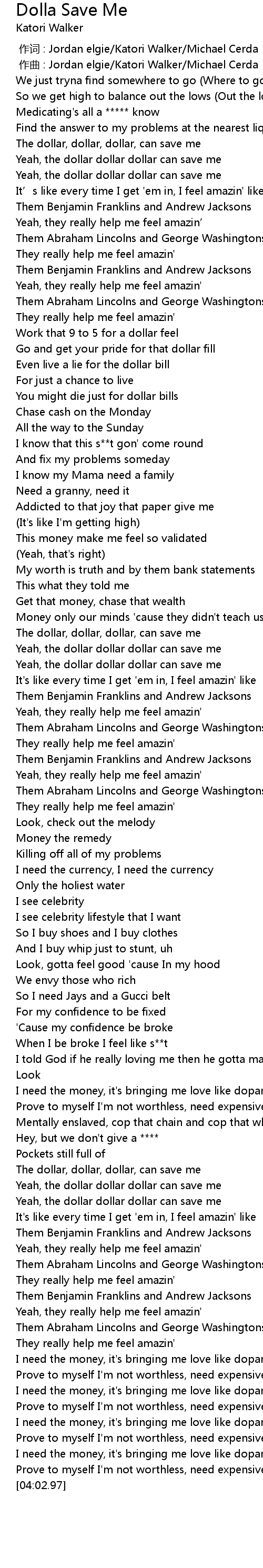 | [03:02.04] | The dollar, dollar, dollar, can save me |