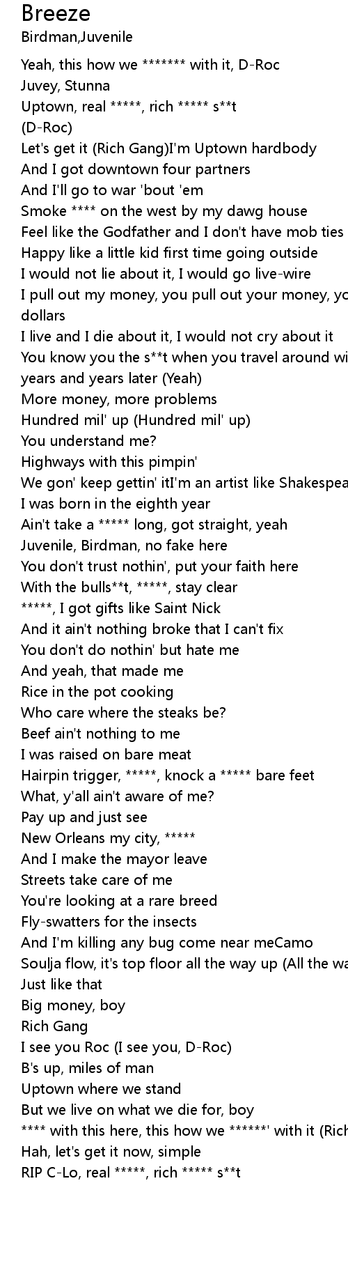 | [00:09.260] | Uptown, real *****, rich ***** s**t |