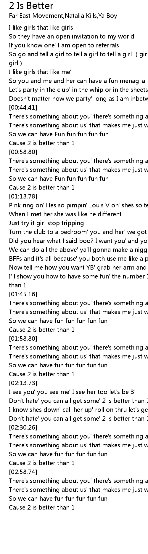 | [00:55.17] | Cause 2 is better than 1 |