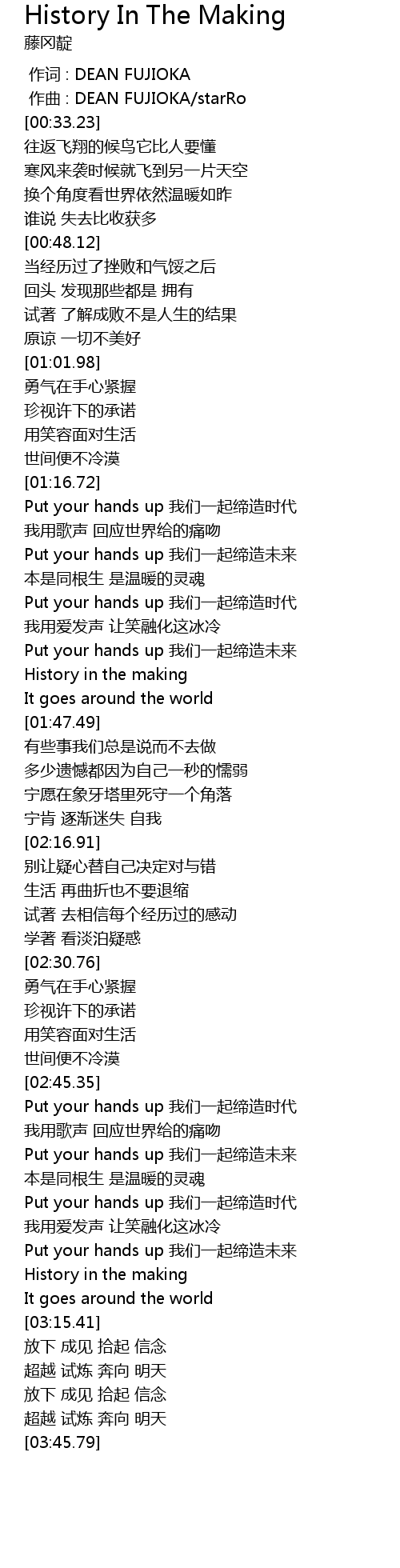 | [03:00.24] | Put your hands up 我们一起缔造时代 |