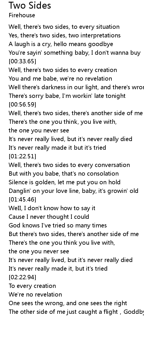 | [00:11.17] | Well, there' s two sides, to every situation |