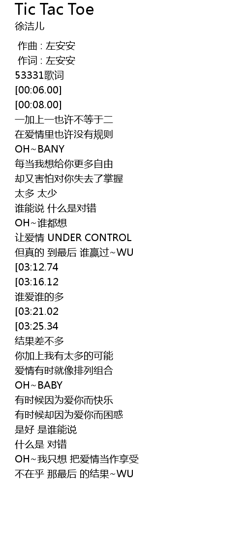 | [03:30.35][03:12.74][02:36.68][01:23.12] | 爱情这游戏就像在玩TIC TAC TOE |