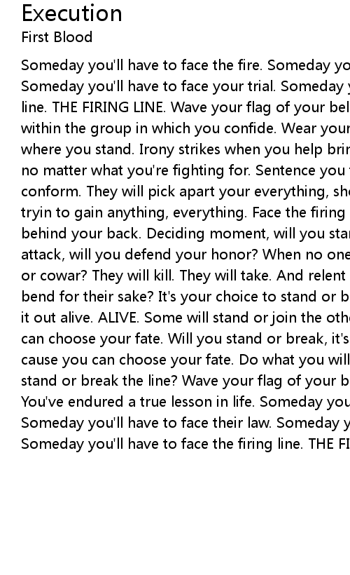 Someday you'll have to face the fire. Someday you'll have to face their law. Someday you'll have to face your trial. Someday you'll have to face the firing line. THE FIRING LINE. Wave your flag of your beliefs and wave it high, safe within the group in which you confide. Wear your mask, let everone know just where you stand. Irony strikes when you help bring your demise. Casualty of war no matter what you're fighting for. Sentence you to death unless you cowardly conform. They will pick apart your everything, shoot you down for anything, tryin to gain anything, everything. Face the firing line. Blindfold, hands behind your back. Deciding moment, will you stand or will you turn back? Under attack, will you defend your honor? When no one has your back, will you press on or cowar? They will kill. They will take. And relent until you break. Will you bend for their sake? It's your choice to stand or break. Most of them won't make it out alive. ALIVE. Some will stand or join the other side. THE OTHER SIDE. You can choose your fate. Will you stand or break, it's up to you. Do what you can cause you can choose your fate. Do what you will, it's up to you, so will you stand or break the line? Wave your flag of your belief's and wave it high. You've endured a true lesson in life. Someday you'll have to face the fire. Someday you'll have to face their law. Someday you'll have to face your trial. Someday you'll have to face the firing line. THE FIRING LINE |