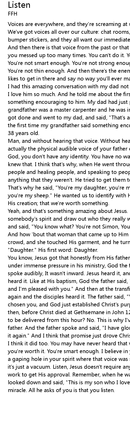 I think it did too. You may have never heard that voice. That voice that says you're worth it. You're smart enough. I believe in you. I love you. There may be a gaping hole in your spirit where that voice was supposed to speak into, and it's just a vacuum. Listen, Jesus doesn't require anything of you. You can't work to get His approval. Remember, when he was affirmed by His father, when God looked down and said, "This is my son who I love." Jesus hadn't done a single miracle. All he asks of you is that you listen. |