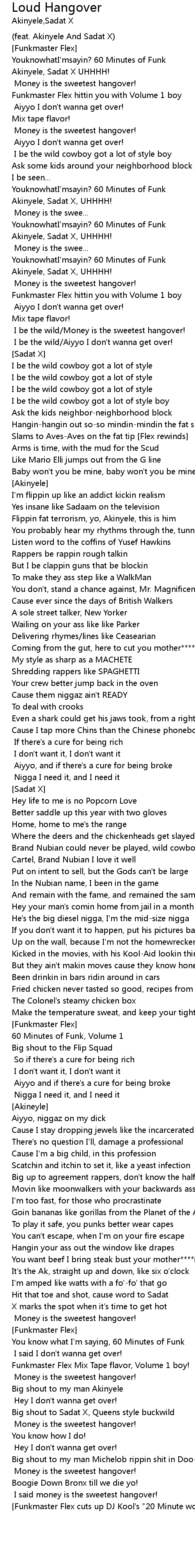 | [Sadat X and Akinyele] I said money is the sweetest hangover! | |