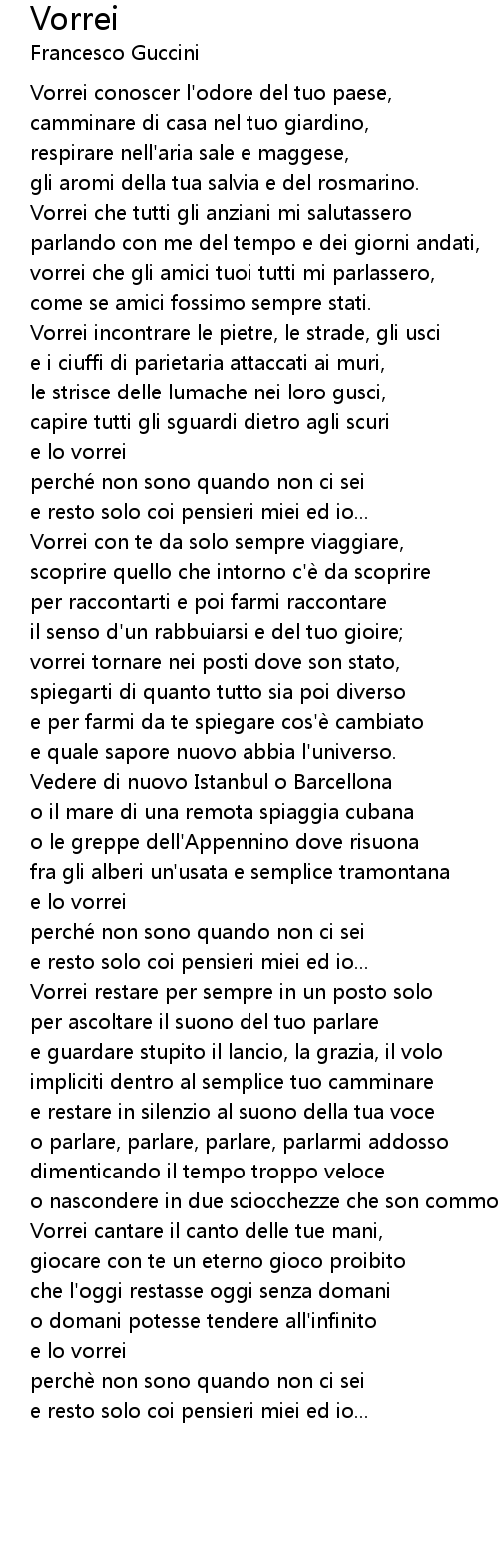 | vorrei che gli amici tuoi tutti mi parlassero, | |