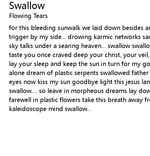 for this bleeding sunwalk we laid down besides and a screaming sky walks and a trigger by my side... drowing karmic networks sad machines inside see the radio sky talks under a searing heaven... swallow swallow swallow swallow the bitter taste you once craved deep your christ, your veil, your sun in bitter blood you lay your sleep and keep the sun in turn for my god, my cancer my painful god alone dream of plastic serpents swallowed father take me home close my stranded eyes now kiss my sun goodbye light this jesus lantern crack my searing heaven... swallow.... so leave in morpheous dreams lay down crestfallen eyes no sad farewell in plastic flowers take this breath away from harm as once a child in kaleidoscope mind swallow... |