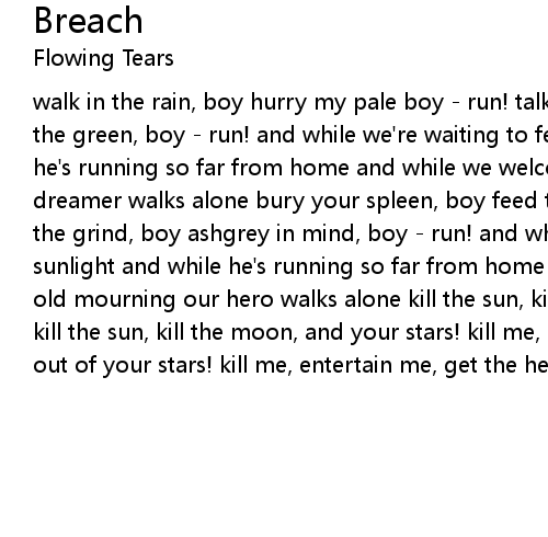 walk in the rain, boy hurry my pale boy - run! talk to the screen, boy splinter the green, boy - run! and while we're waiting to feel the sunlight and while he's running so far from home and while we welcome the same old morning our dreamer walks alone bury your spleen, boy feed the machine, boy - run! slave to the grind, boy ashgrey in mind, boy - run! and while waiting to feel the sunlight and while he's running so far from home and while we welcome the same old mourning our hero walks alone kill the sun, kill the moon, kill the stars! kill the sun, kill the moon, and your stars! kill me, entertain me, get the hell out of your stars! kill me, entertain me, get the hell out of your scars! |