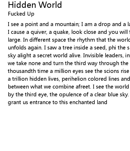 I see a point and a mountain; I am a drop and a lake. I am a speck and a beast; I cause a quiver, a quake, look close and you will find a place where small is large. In different space the rhythm that the world sustains unfolds and then unfolds again. I saw a tree inside a seed, phi the sky and shells and hives a sky alight a secret world alive. Invisible leaders, invisible laws of two sides; we take none and turn the third way through the wall a thousand times. In a thousandth time a million eyes see the scions rise a billion sons. Apogee begun a trillion hidden lives, perihelion colored lines and scented signs lead us between what we combine afreet. I see the world with clarity hidden world seen by the third eye, the opulence of a clear blue sky. Heaven's been kind enough to grant us entrance to this enchanted land |