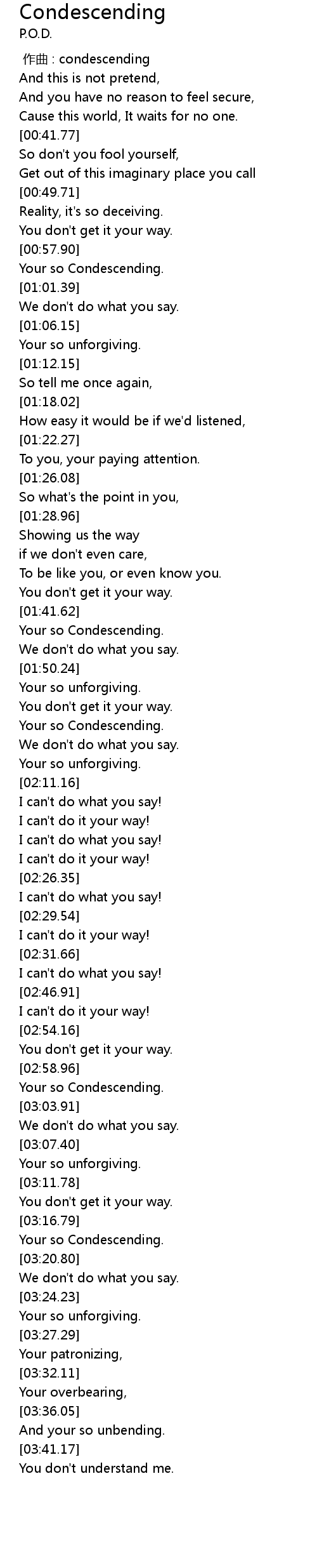 | [02:01.66] | Your so Condescending. |