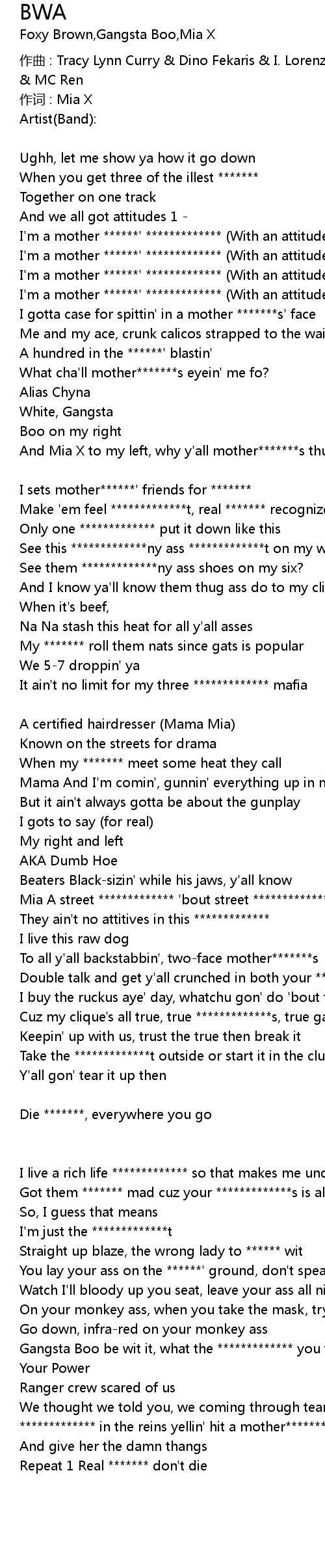 | And Mia X to my left, why y'all mother*******s thugged up 44 bulldogs and tear the whole mother******' club up (Tear the club up, feel me? Uh) [Lil' Ahu] | |