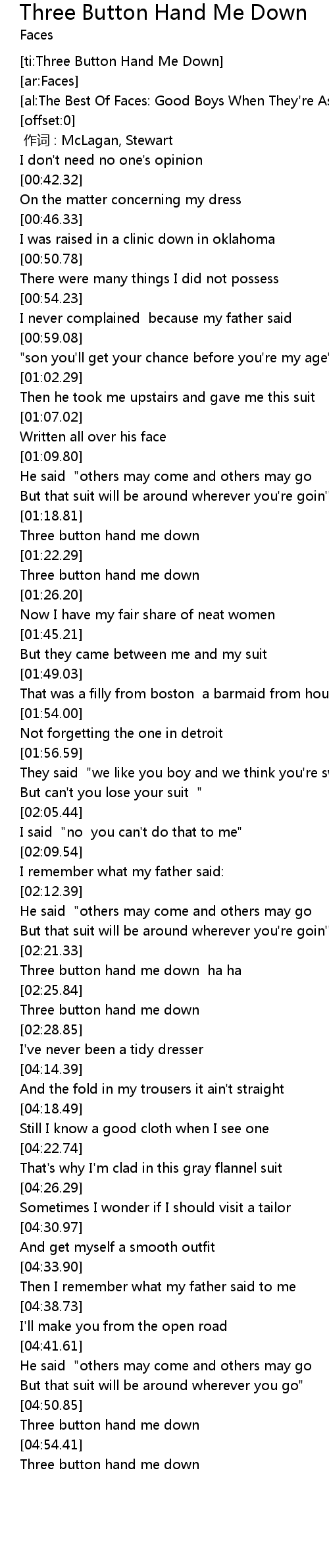 | [01:24.12] | Three button hand me down |