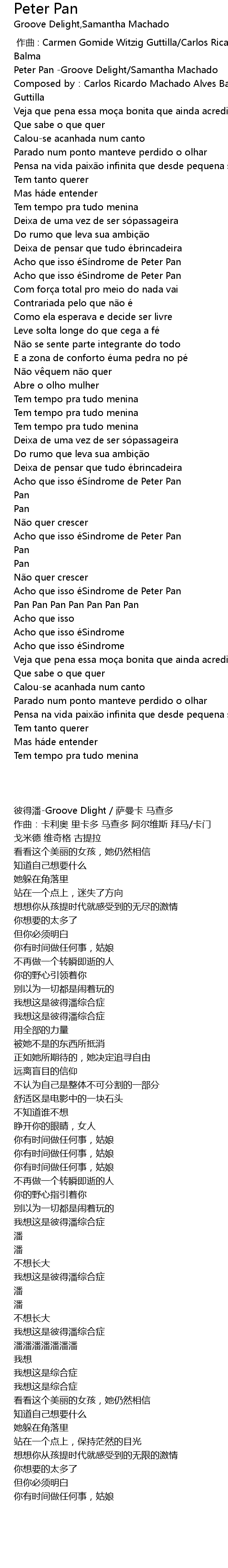 | [00:00.102] | 彼得潘-Groove Dlight / 萨曼卡 马查多 |