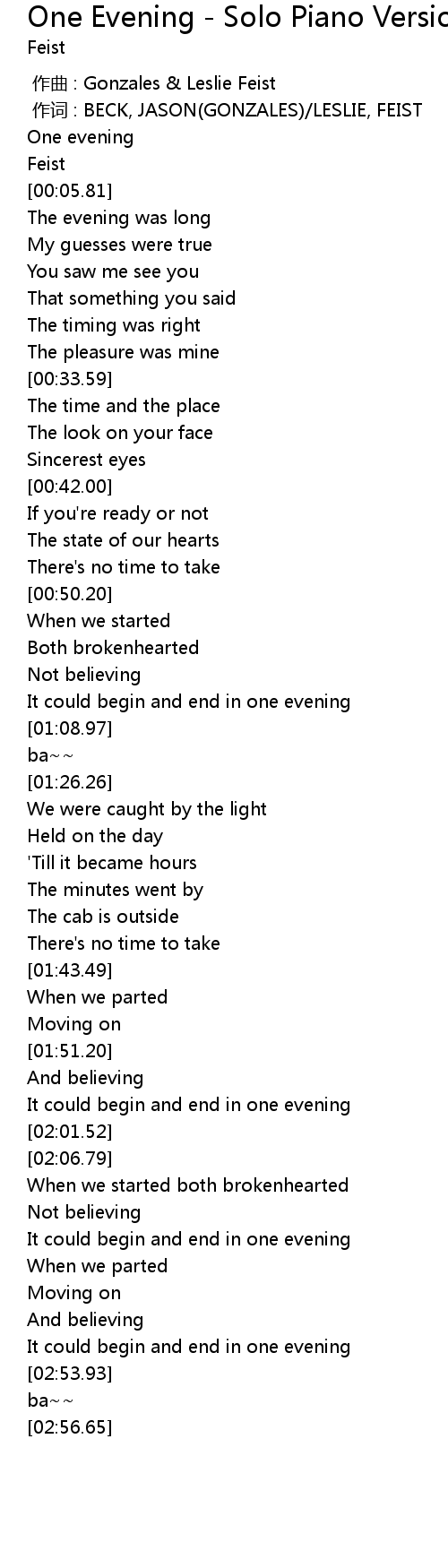 | [00:00.670] | 作词 : BECK, JASON(GONZALES)/LESLIE, FEIST |
