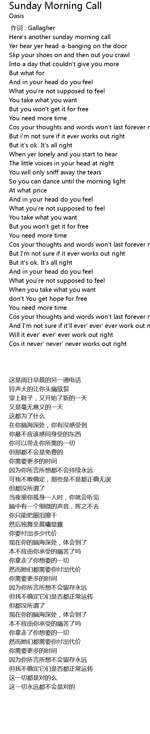 | [00:00.00] | Here s another sunday morning call |