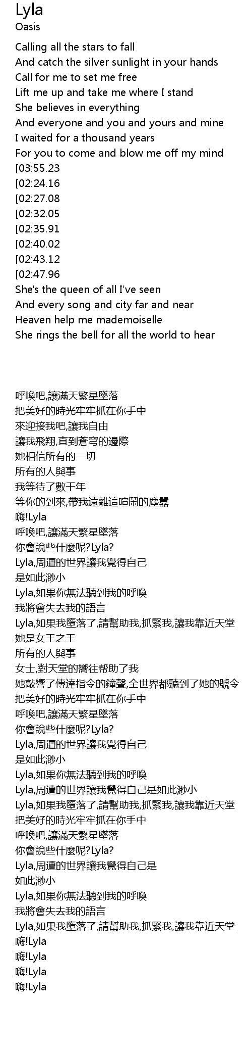 | [04:03.19][03:55.23][03:47.44][03:39.59][03:07.74][02:20.46][01:08.99] | Hey LYLA |