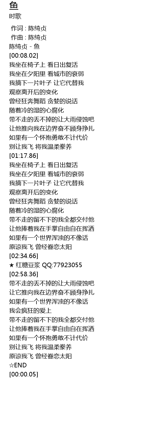 | [00:01.00] | 陈绮贞 - 鱼 |