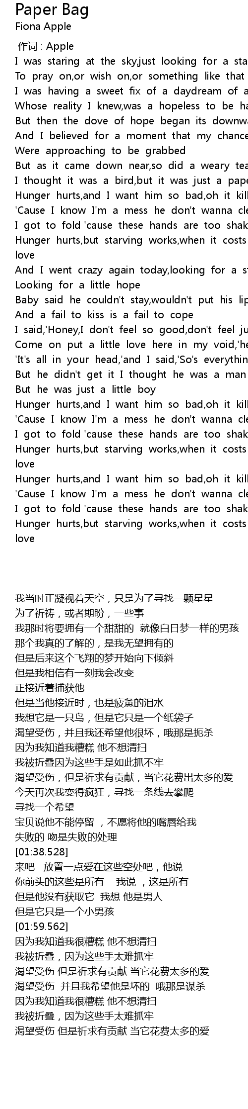 | [02:23.536] | Hunger hurts,and I want him so bad,oh it kills |