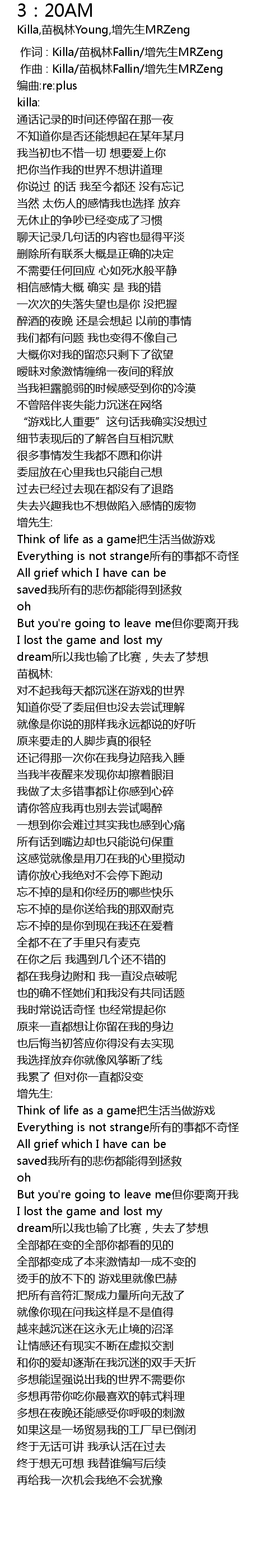 | [00:01.000] | zuò qǔ : Killa miáo fēng lín Fallin zēng xiān shēng MRZeng |