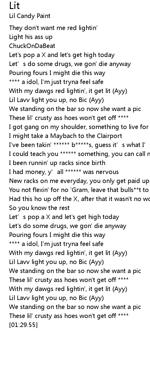 | [00:22.47] | With my dawgs red lightin', it get lit Ayy |