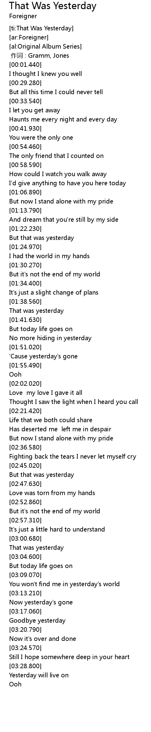 | [03:29.660] | Yesterday will live on |