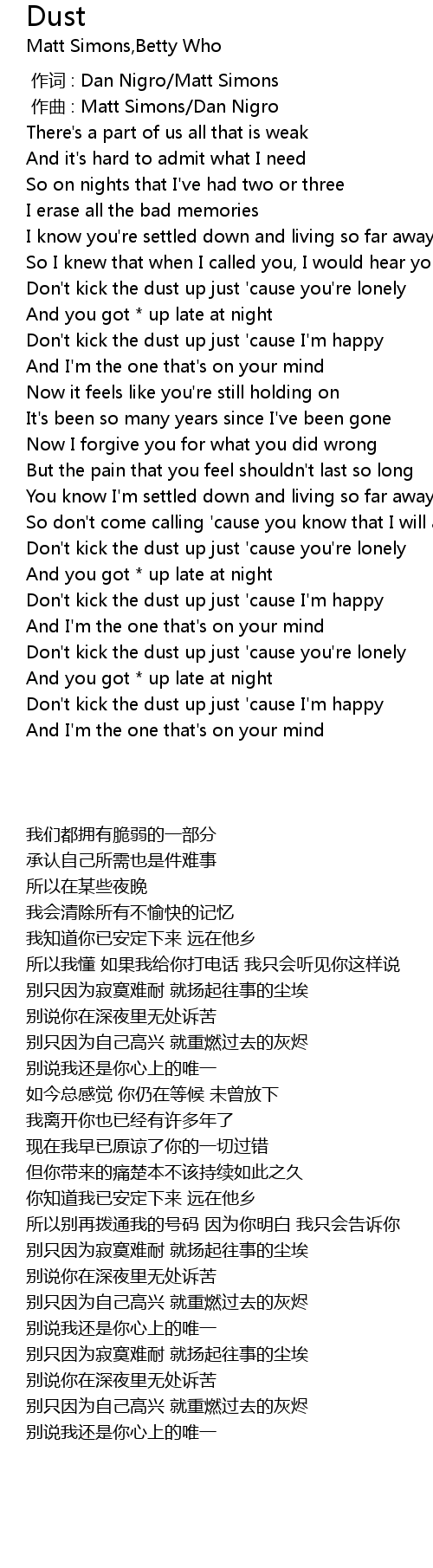 | [00:47.73] | Don' t kick the dust up just ' cause you' re lonely |