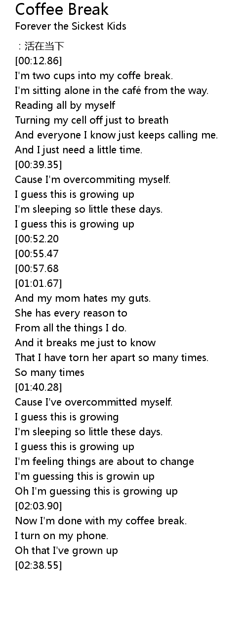 | [02:24.85] | Now I' m done with my coffee break. |
