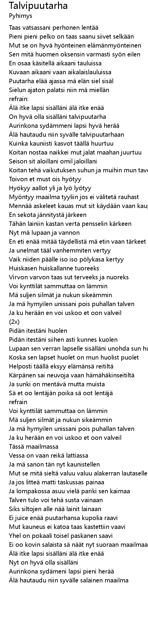 | Puutarha elää ajassa mä elän siel sisäl | |