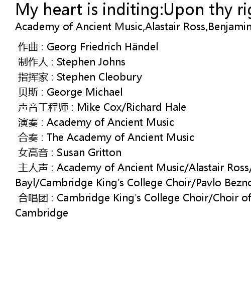 | [00:00.000] | 主人声 : Academy of Ancient Music/Alastair Ross/Benjamin Bayl/Cambridge King's College Choir/Pavlo Beznosiuk/Stephen Cleobury |