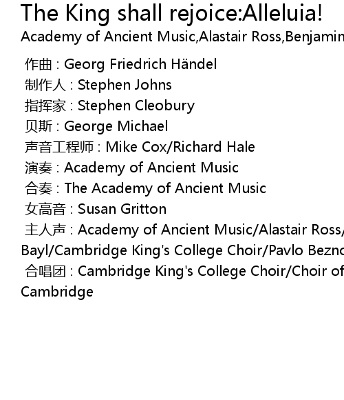 | [00:00.000] | zhǔ rén shēng : Academy of Ancient Music Alastair Ross Benjamin Bayl Cambridge King' s College Choir Pavlo Beznosiuk Stephen Cleobury |