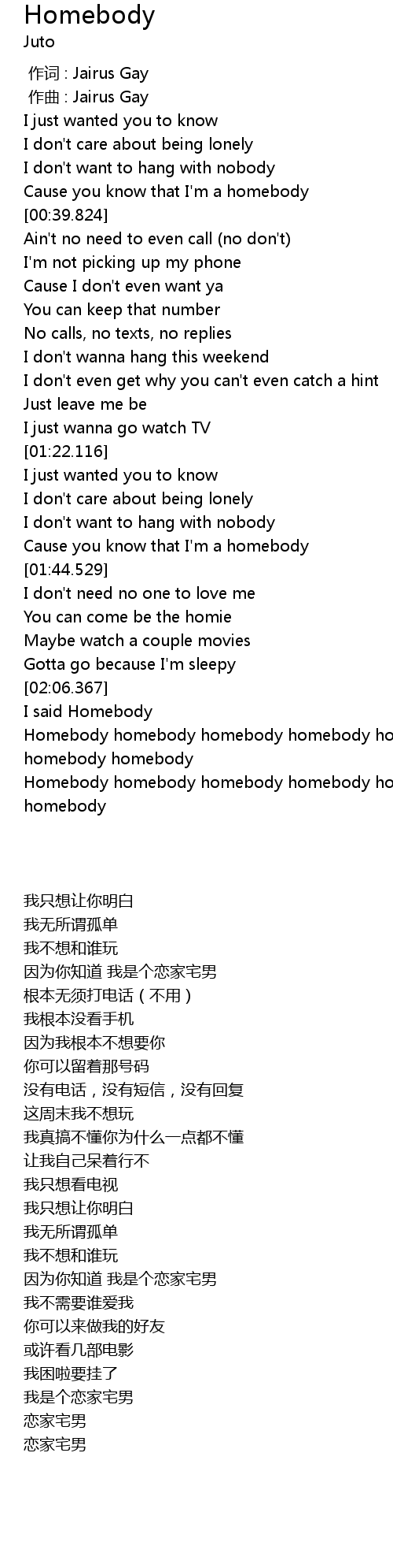 | [00:35.252] | Cause you know that I' m a homebody |