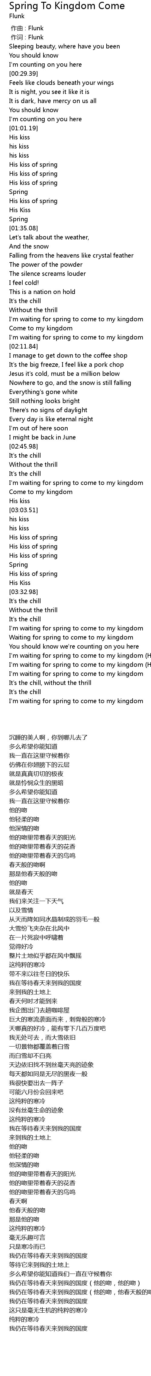 | [04:15.03] | 我仍在等待春天来到我的国度(他的吻,他春天般的吻) |