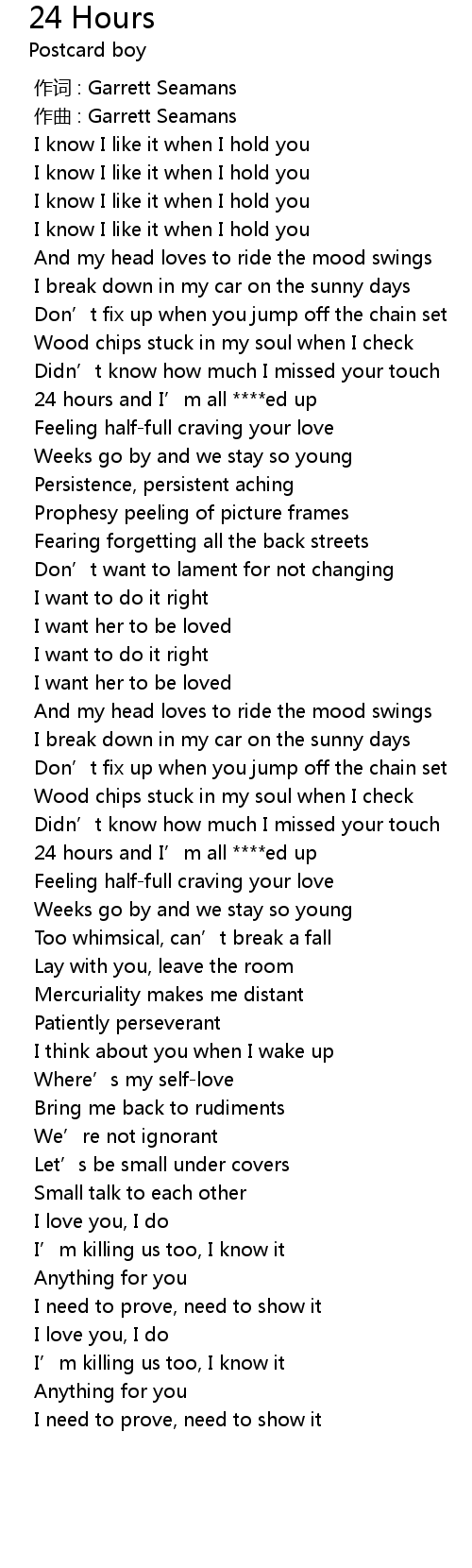 | [02:03.875] | 24 hours and I' m all ed up |