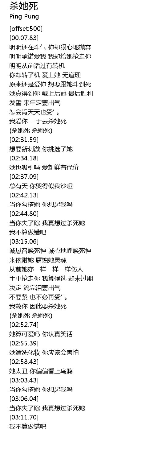 | [01:38.76] | wǒ jiù nǐ yīn cǐ yào shā tā sǐ |