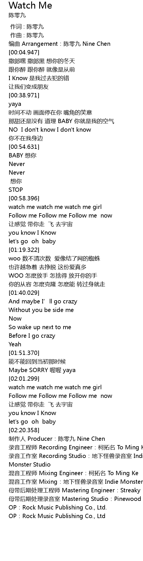 | [00:04.074] | 编曲 Arrangement:陈零九 Nine Chen |