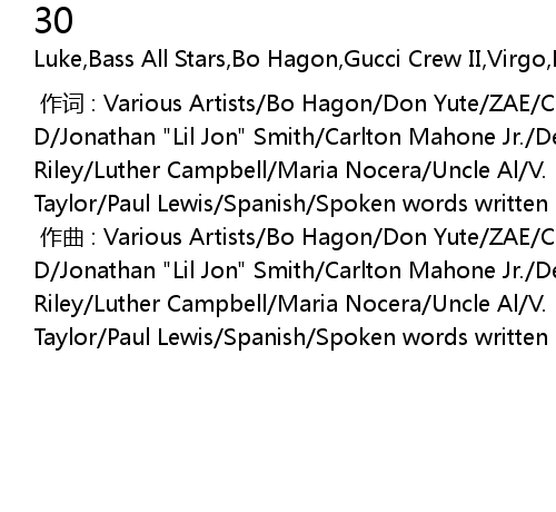 | [00:00.000] | zuo qu : Various Artists Bo Hagon Don Yute ZAE C. Bell Danny D Jonathan " Lil Jon" Smith Carlton Mahone Jr. Devastator X Lathun Melvin Riley Luther Campbell Maria Nocera Uncle Al V. May Floyd Fisher Roger Taylor Paul Lewis Spanish Spoken words written by: Corina Ayala Tony Butler |