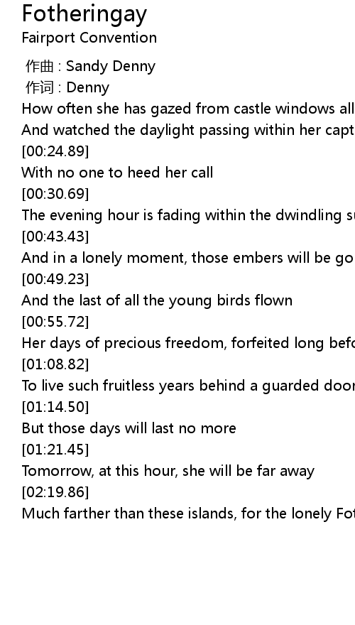 | [02:20.86] | Much farther than these islands, for the lonely Fotheringay |