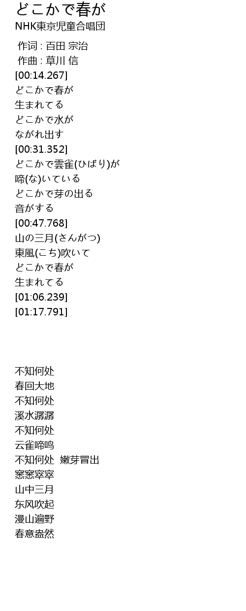 | [00:32.070] | どこかで雲雀(ひばり)が |