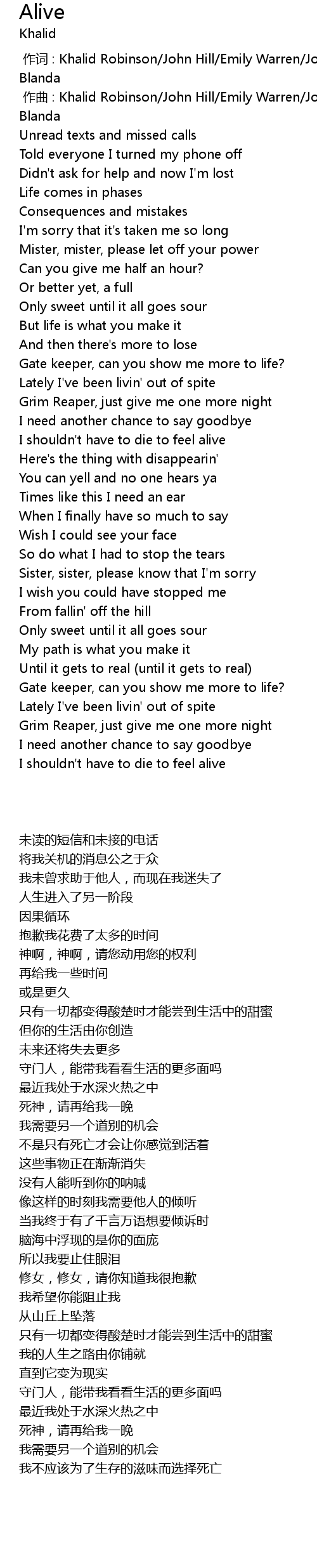 | [00:01.000] | zuo qu : Khalid Robinson John Hill Emily Warren Jon Hoskins John Blanda |