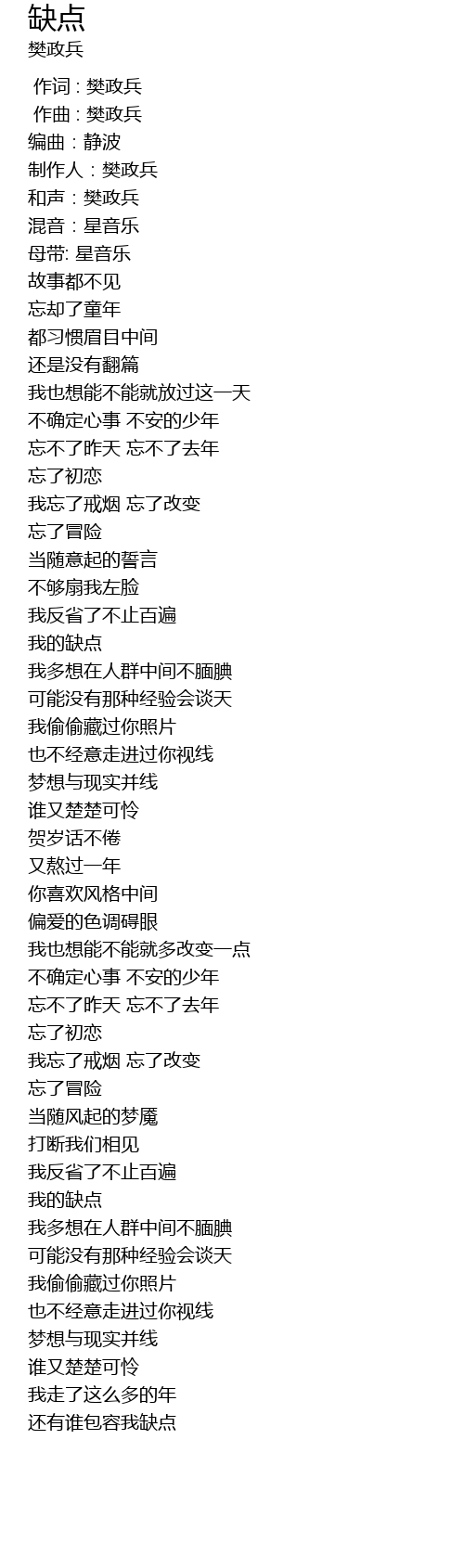 | [00:00.000] | 作词 : 樊政兵 |