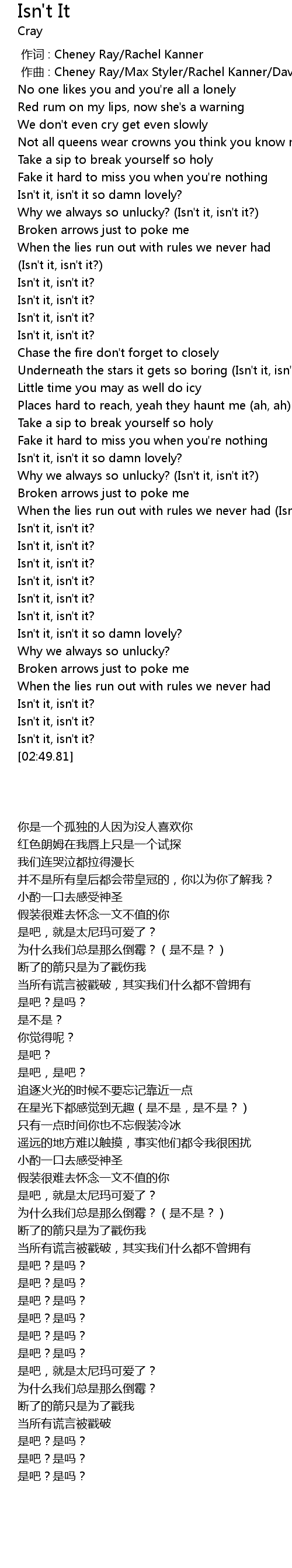 | [01:31.60] | Why we always so unlucky? (Isn't it, isn't it?) |