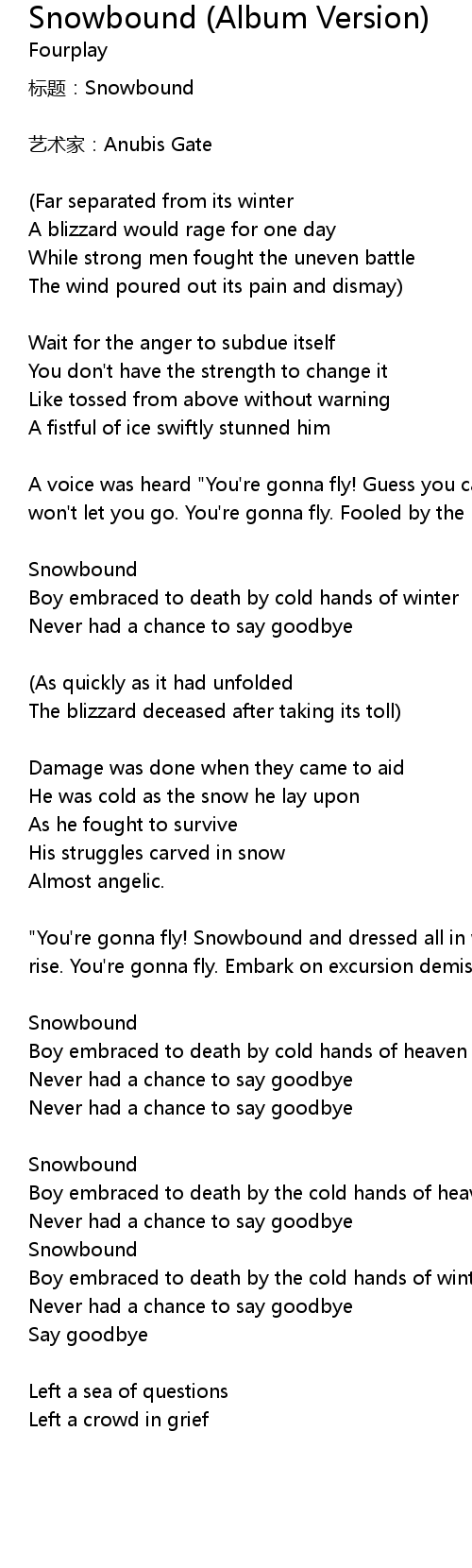 | "You're gonna fly! Snowbound and dressed all in white. But your spirit will rise. You're gonna fly. Embark on excursion demise." | |