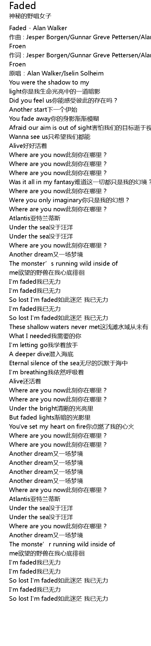 | [00:08.165] | yuán chàng: Alan Walker Iselin Solheim |